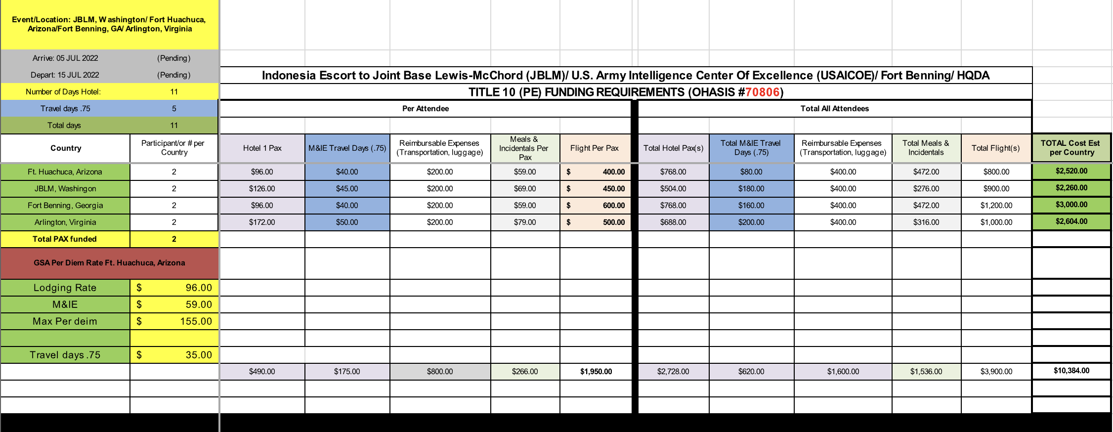 This project served as an initial means to better streamline the processes required to coordinate engagements with partner nation personnel. While during virtual meetings it was easy to say, “Let’s meet in Hawaii next June for a conference”, it was diffcult to plan for all the various aspects related to hosting an event. This spreadsheet formed the means to be able to expedite the calculation of cost estimates to allow for quicker approvals of reserving funds for the event.